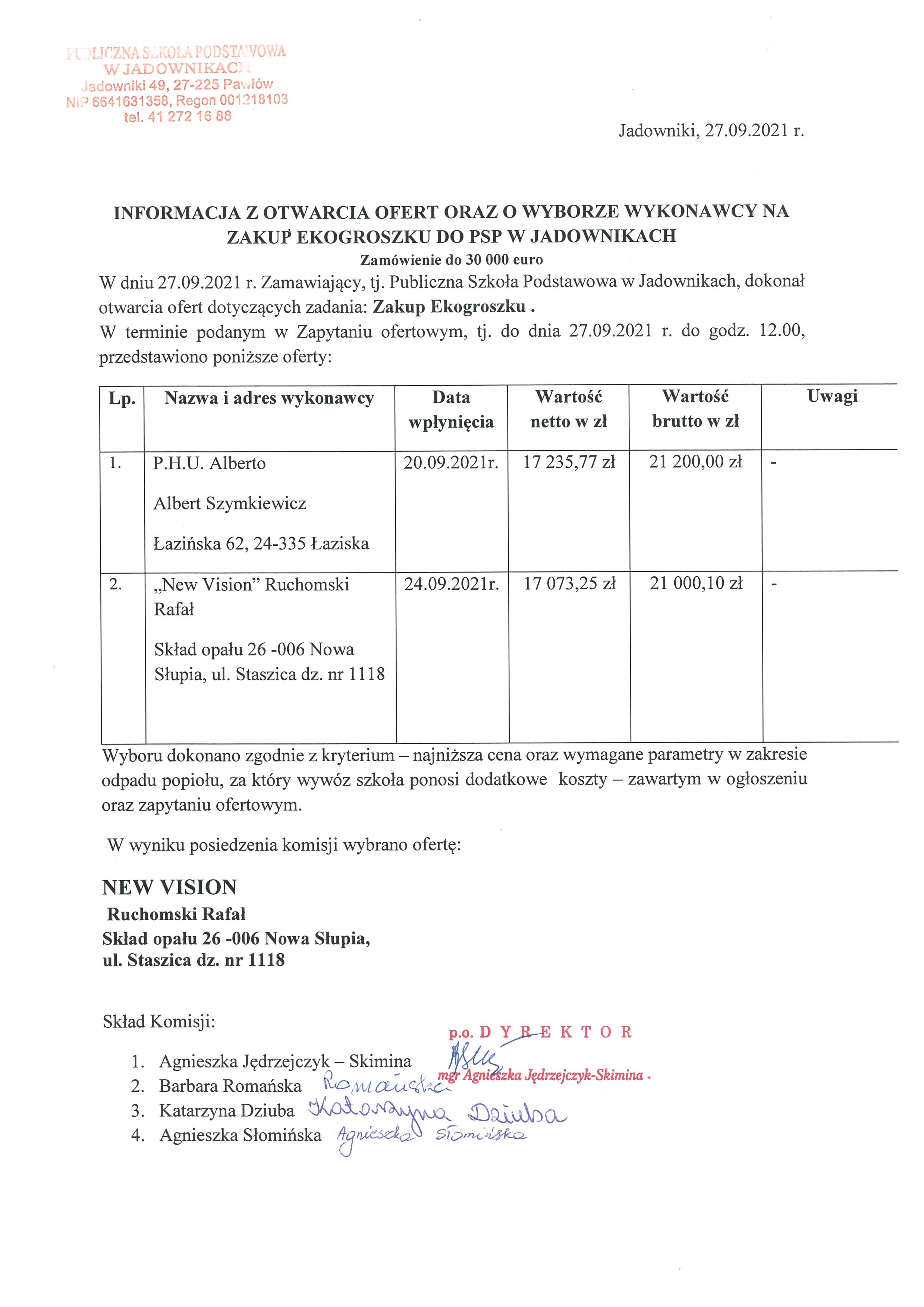 - Informacja z otwarcia ofert i wyborze wykonawcy na zakup ekogroszku 25 września 2023